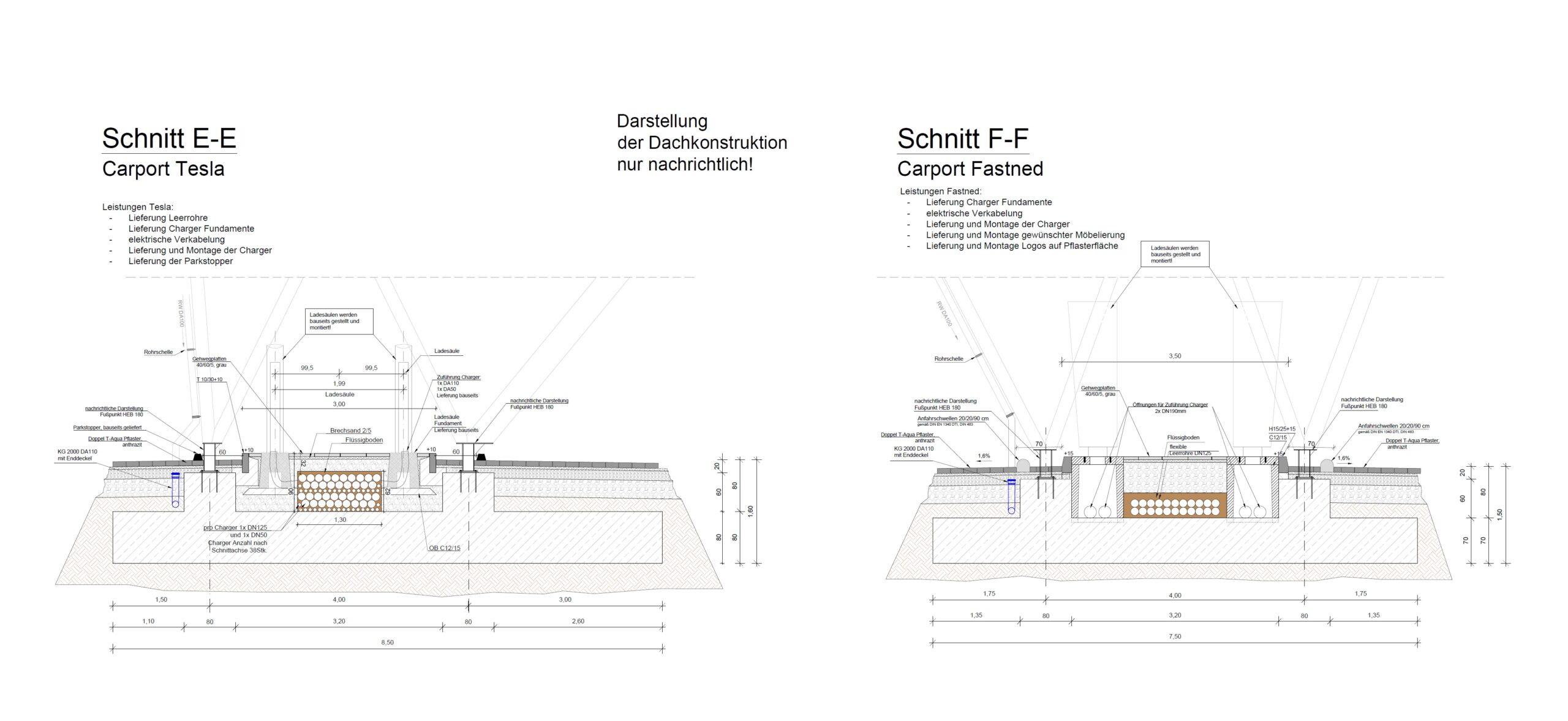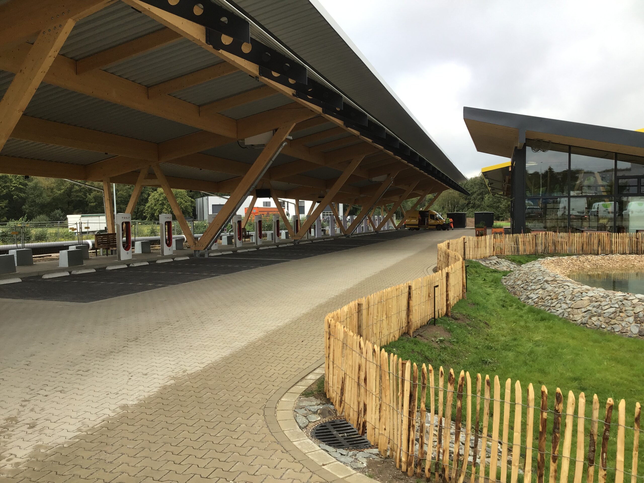 Die Ladepark Kreuz Hilden GmbH realisiert im Gewerbegebiet Giesenheide am Hildener Autobahnkreuz einen der größten Ladeparks für Elektroautos. Neben hauseigenen Ladesäulen sollen über die Pächter Tesla und Fastnet mit deren Schnellladesäulen auch etablierte Player der Elektromobilität vertreten sein. Das anfallende Niederschlagswasser kann allerdings nicht in den öffentlichen Kanal abgeleitet werden und muss über Mulden versickert werden. Der Grundwasserstand liegt jedoch nahe an der Geländeoberkante und die sich ergebenden Leitungslängen für die Entwässerung der großen Carports unter denen sich die Ladesäulen befinden machen eine klassische kanalisierte Leitungsführung zu einer oberirdischen Versickerungsanlage unmöglich. Daher wurden dauereigestaute Leitungsnetze vorgesehen, welche nach dem Prinzip der kommunizierenden Röhren das Niederschlagswasser mittels Quellschacht in die vorgesehenen Mulden überlaufen lassen. Die nicht überdachten Oberflächen wurden mit einem sickerfähigen Belag versehen, welcher das Wasser an Ort und Stelle in den Untergrund abführt. Für die unterirdische Ladeinfrastruktur mussten mehrere Kilometer Schutzrohr und Kabel verlegt werden.