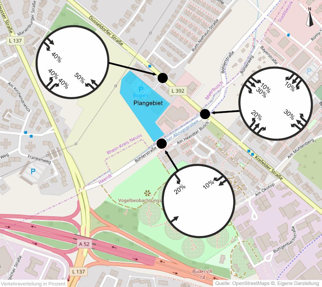 Für die Erweiterung des Unternehmens „Bogies Pflanzenwelt“ und den Neubau eines Lebensmitteldiscounters war zu prüfen, ob das umliegende Straßennetz die entstehenden Neuverkehre aufnehmen kann. Dafür wurden die schon bestehende und die neue Anschlussstelle und ein Knotenpunkt süd-östlich des Plangebiets auf ihre Leistungsfähigkeit überprüft.