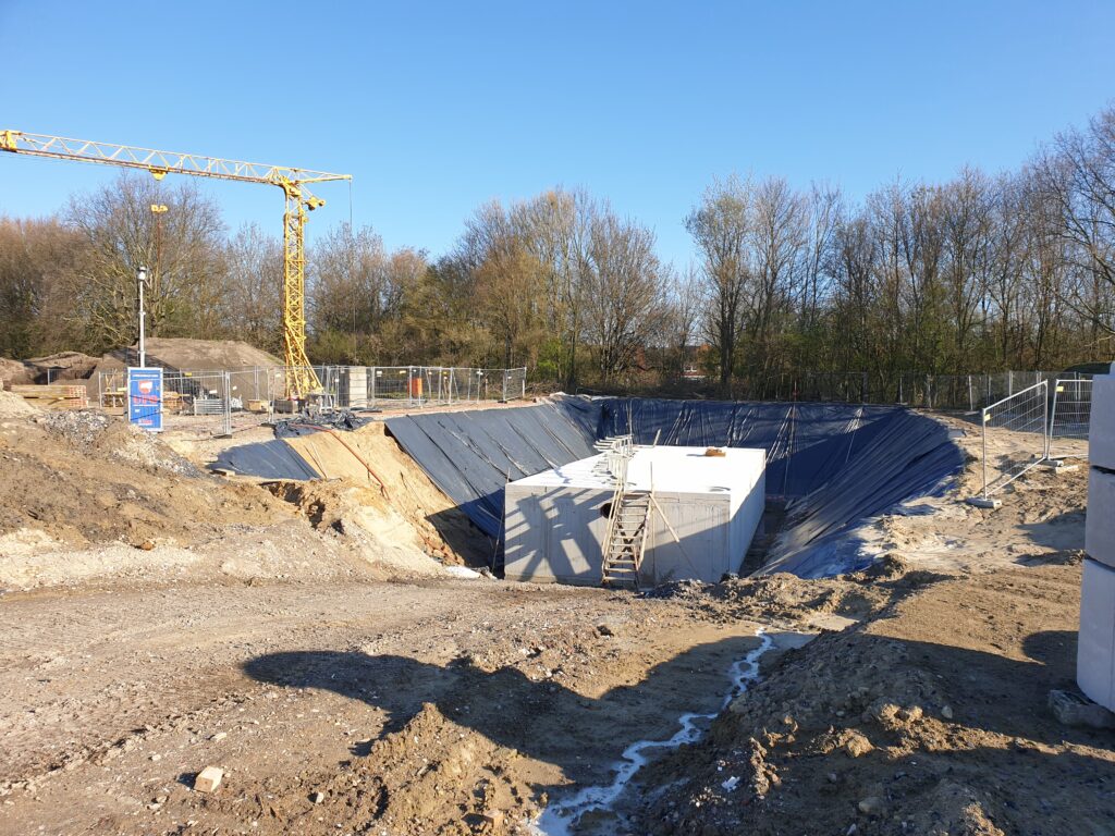 Die Erschließungsarbeiten bis zur Herstellung der Baustraße wurden termingerecht für den Auftraggeber, die IB-Wohnungs- und Gewerbebau GmbH aus Ochtrup, hergestellt. Auch die kreuzenden Ver- und Entsorgungsleitungen für den Kanalanschluss in 6,00 m Tiefe konnten die Baumaßnahme nicht stoppen. Derzeit laufen die Hochbauarbeiten, die Straßenendausbauarbeiten folgen entsprechend.
