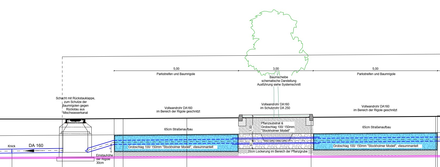 Im Zuge der Planung des Projekts Ringstraße in Essen wurde sowohl die öffentliche wie auch die private Erschließung geplant. Besonderheiten liegen hier in der Privaten Erschließung. Diese wird mit einem Mischwasserkanal geplant, erhält jedoch zusätzlich eine Oberflächenentwässerung mit Baumrigolen. Die Baumrigolen erhalten ihre Wassereinspeisung durch die Sinkkästen in der Straße. Die Baumrigolen selber werden mit einer Mischung aus Grobschlag-Gestein, Einschlämm-Substrat und Pflanzenkohle hergestellt. Durch diese Planung erhält das Oberflächenwasser eine neue Bedeutung und kann so den Bäumen das benötigte Wasser zuführen. Alles überschüssige Wasser wird dann dem Kanal zugeführt. Eine Rückstauklappe verhindert, dass bei starken Regenereignissen ein Rückstau des Kanals in die Rigolen erfolgt. |