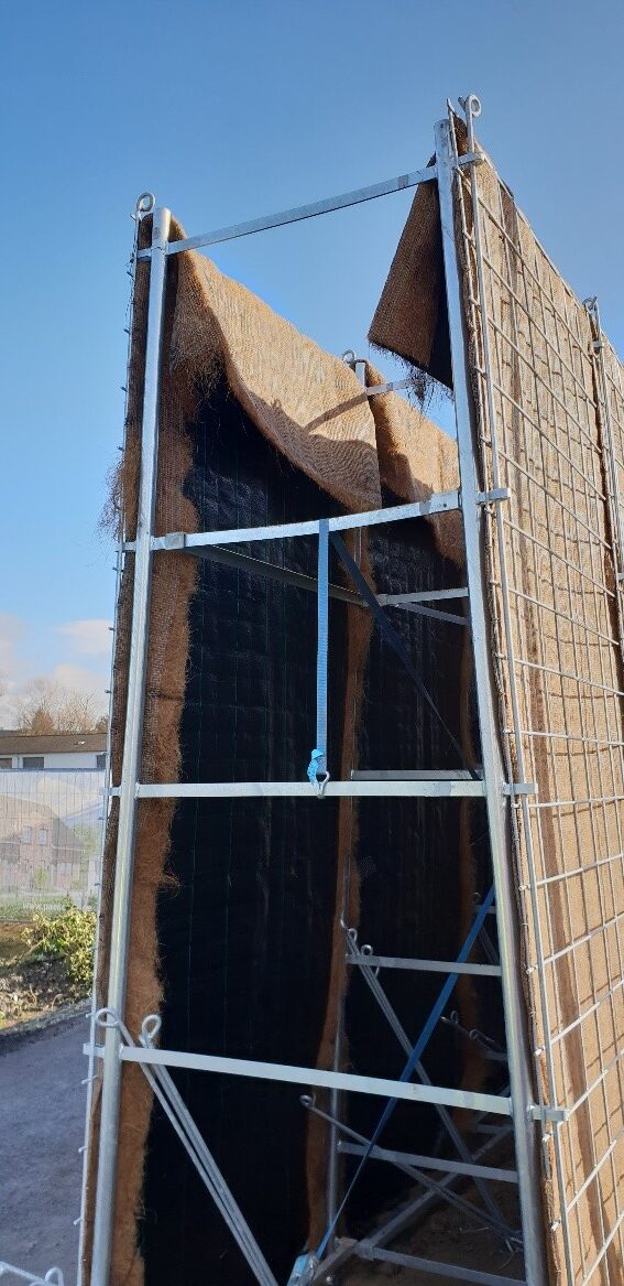 Die geplante und gebaute Lärmschutzwand bietet den Vorteil, dass keine tiefgehende Stahlträger-Gründung nötig wird, sondern eine verdichtete Schottertragschicht ausreichend ist. Des Weiteren kann durch die Nutzung eines Stahl-Stecksystems ein schneller und unkomplizierter Aufbau gewährleistet werden. Die anschließende Ummantelung mit Kokosfasermatten verhindert ein herausfallen des Füllmaterials und bietet gleichzeitig eine natürliche Rankhilfe.