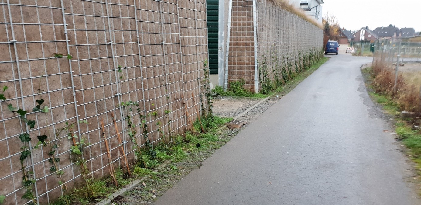 Für die neue Erschließung Locher Wiesen in Langenfeld wurde eine bestehende Stützmauer zurückgebaut und durch eine neue begrünte, hochabsorbierende Lärmschutzwand ersetz.